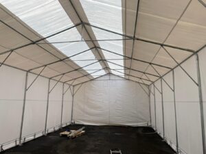 Our industrial tent is the strongest marquee/tent we stock. The main aim when manufacturing this tent was to make it as sturdy and secure as possible. The PVC is very thick and was manufactured all in one piece, instead of separate windows, doors and roof. Again being 100% waterproof and labelled fire resistant, these tents are popular with businesses and charities that want to store equipment or even use it as their own warehouse/showroom. Some of our industrial tents have skylights as a feature in the roof (as you can see in some of these pictures), this can be extremely useful to businesses that are planning to use this space as a showroom or workspace as natural light will shine through.