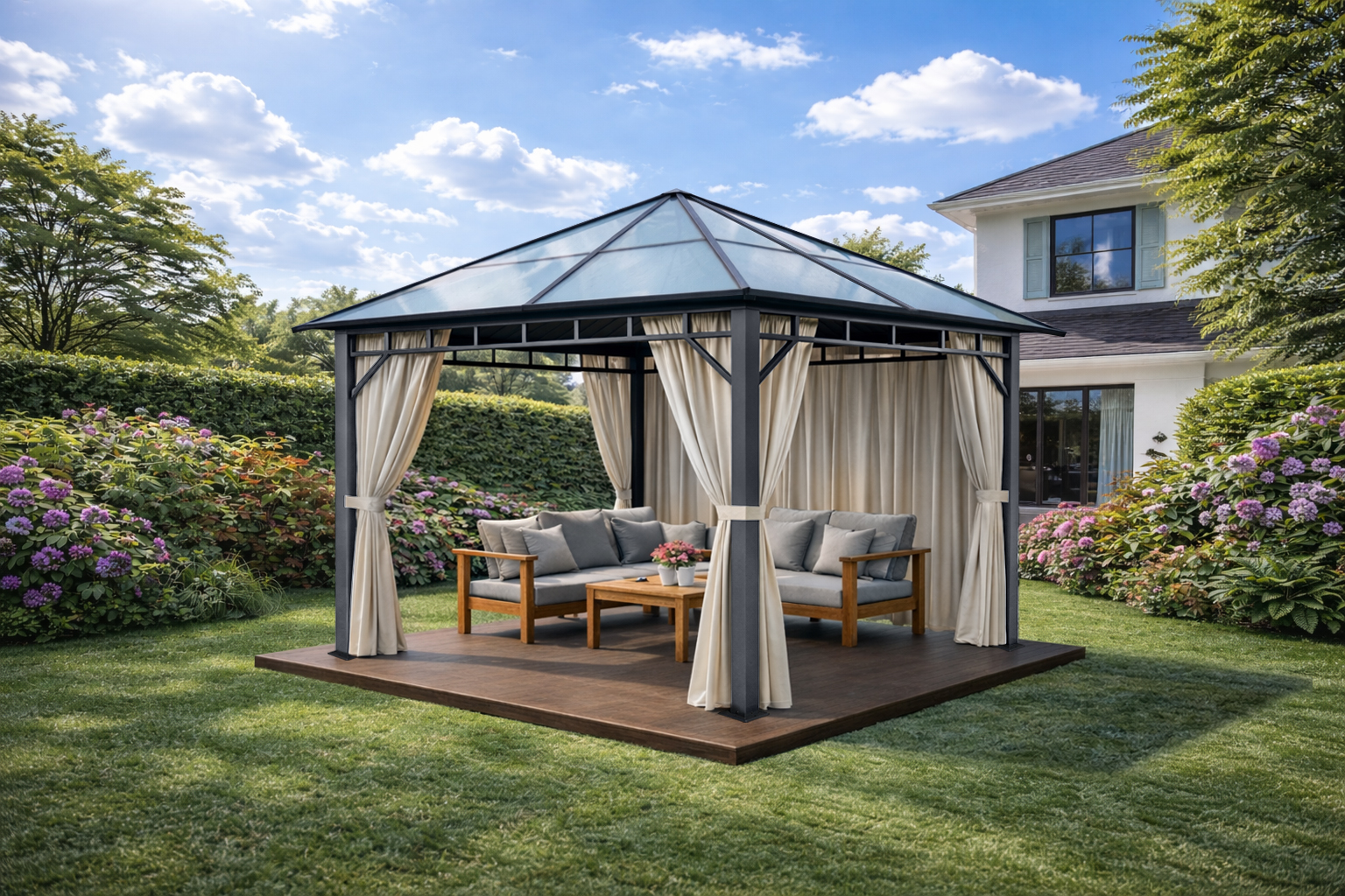 Whether used as a garden lounge, dining area, or sheltered spot for relaxing outdoors, this premium gazebo combines modern design with practical all-weather performance.