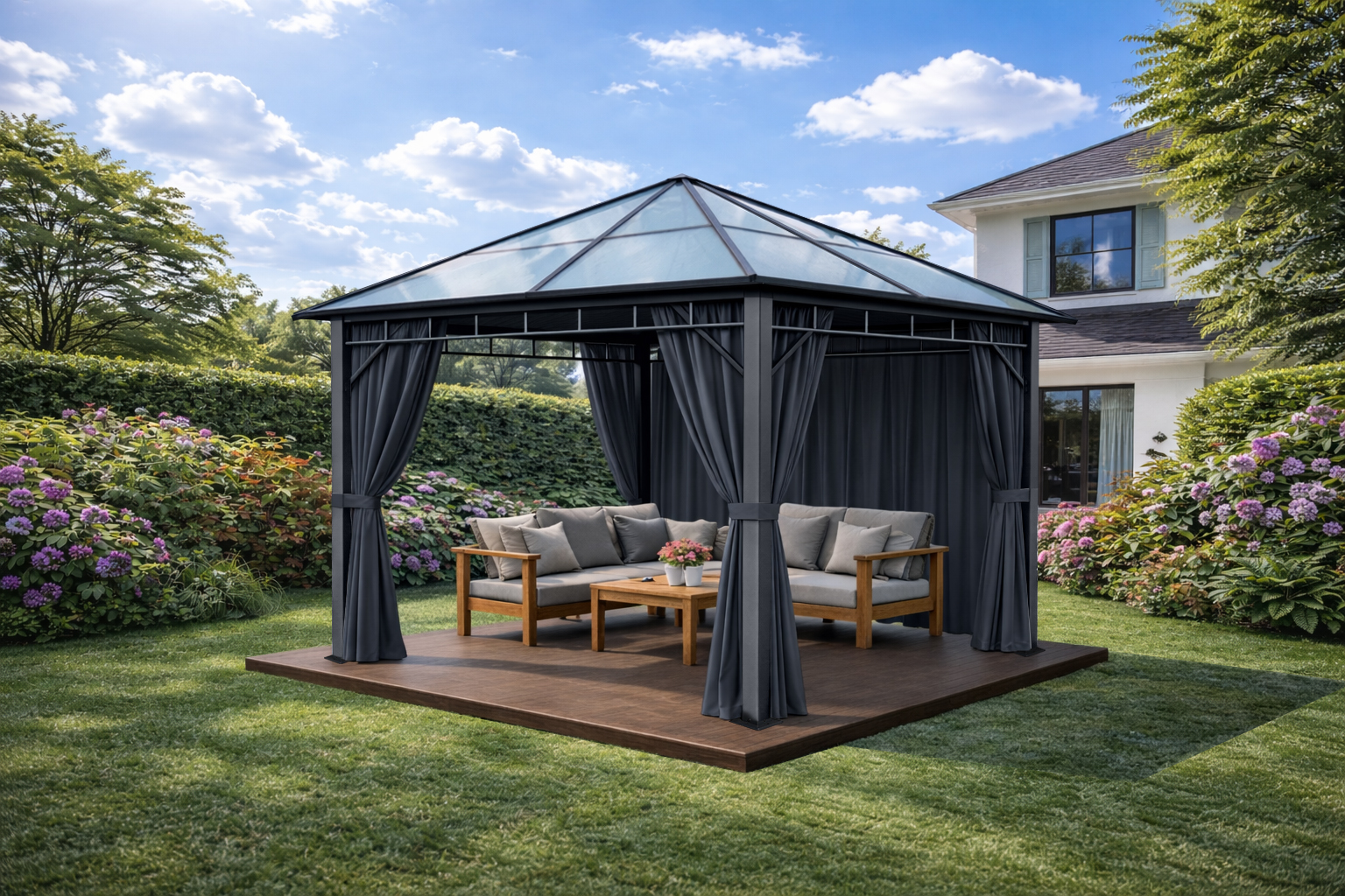 Whether used as a garden lounge, dining area, or sheltered spot for relaxing outdoors, this premium gazebo combines modern design with practical all-weather performance.