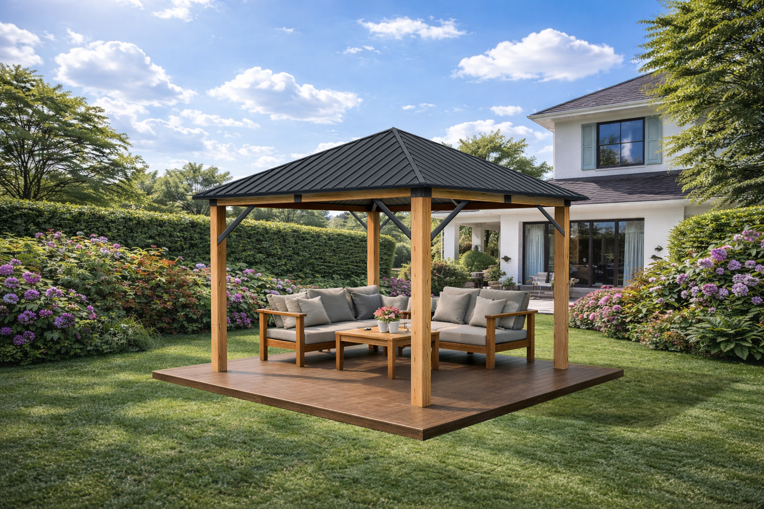 Whether used as a garden lounge, dining area, or sheltered spot for relaxing outdoors, this premium gazebo combines modern design with practical all-weather performance.