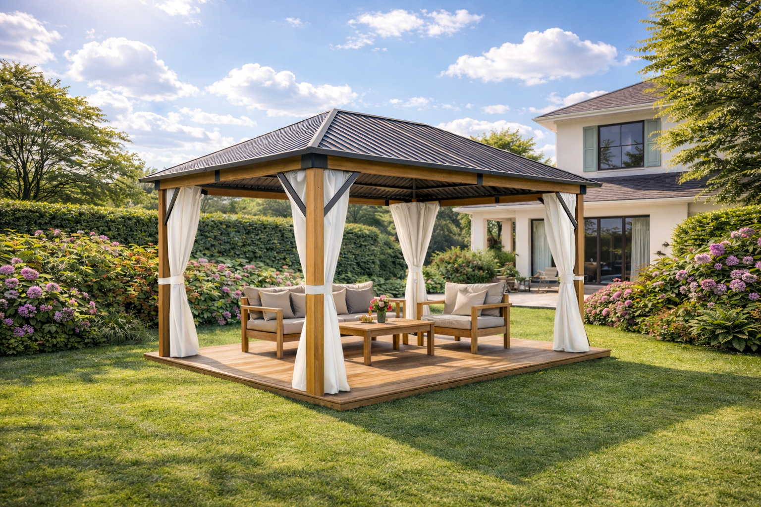 Whether used as a garden lounge, dining area, or sheltered spot for relaxing outdoors, this premium gazebo combines modern design with practical all-weather performance.